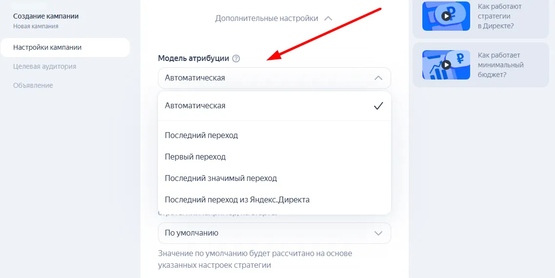 Под выбором целей открываются дополнительные настройки. В них можно выбрать модель атрибуции — это правило, какой переход на сайт считать источником конверсии.