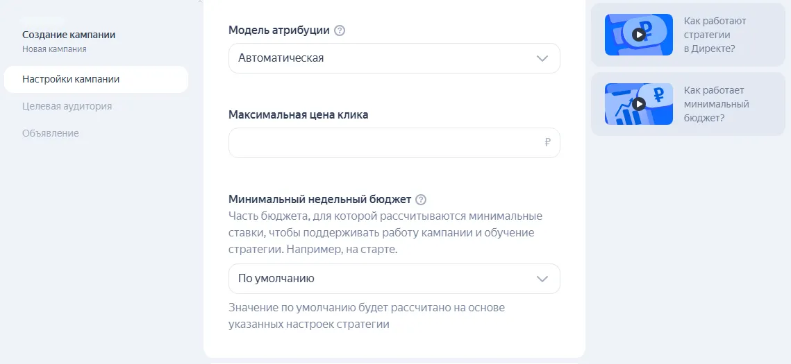 После выбора модели атрибуции вы можете самостоятельно настроить максимальную цену клика. Система будет придерживаться заданного уровня. Здесь же можно установить минимальный недельный бюджет.