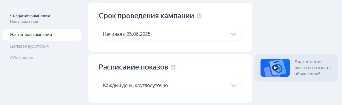 Установите дату начала и окончания кампании и расписание показов. Это важно, если вы хотите получать заявки только в часы работы компании и сразу же их обрабатывать.