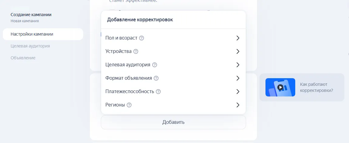 В этом разделе вы можете самостоятельно настроить корректировки ставок. Они нужны для эффективного распределения бюджета на рекламу.