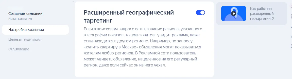 Расширенный географический таргетинг. Показывает объявления пользователям из других регионов, если в их запросах или поведении есть упоминания нужного местоположения. Например, если вы сдаете в аренду загородные дома в Карелии, с помощью расширенного геотаргетинга можно показывать рекламу жителям Москвы, которые интересовались в Яндексе достопримечательностями и туристическими маршрутами Карелии.