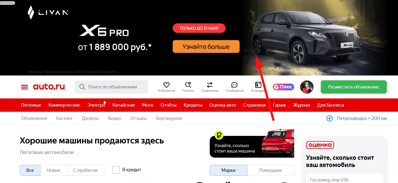 Пример рекламы РСЯ на сайте Auto.ru. Слева наверху есть значок «Реклама» — если на него нажать, попадаешь в Яндекс Директ