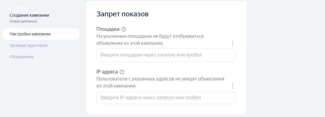 Запрет показов. Площадки, на которых не будут показываться ваши объявления.