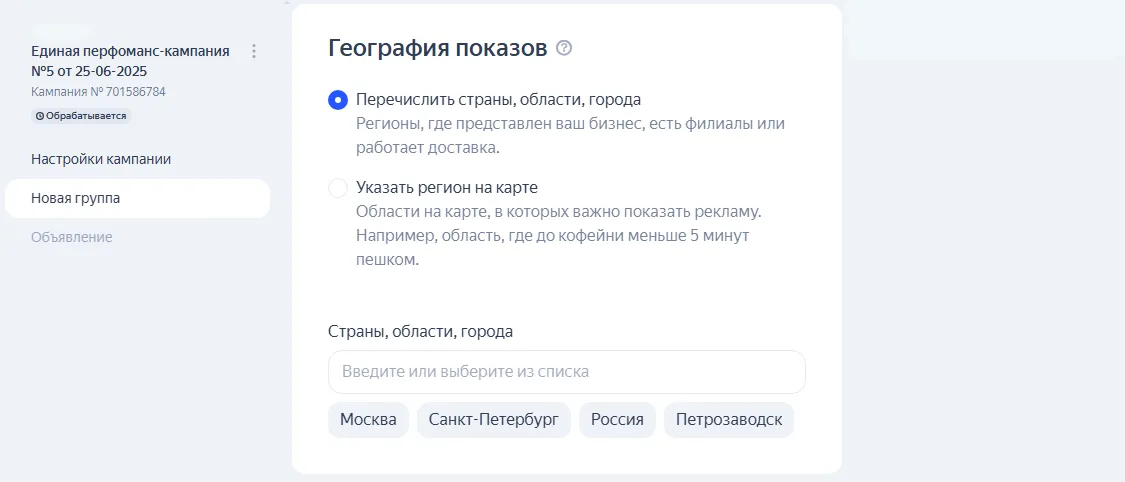 География показов. Страны, области или регионы, где будет показано объявление