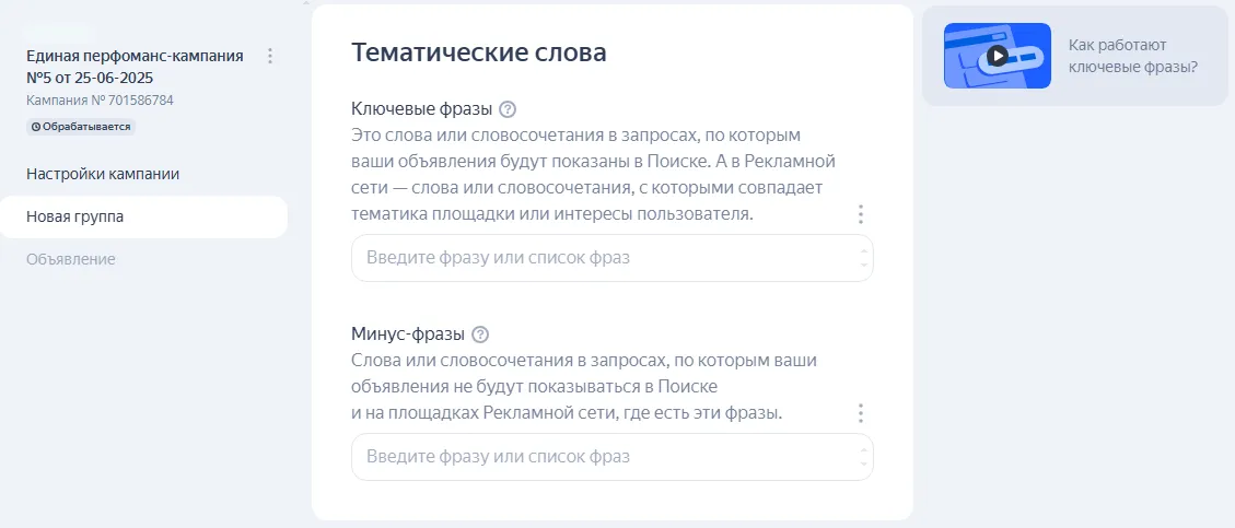 Тематические слова. Ключевые фразы, с которыми совпадает тематика площадки или интересы пользователя, и минус-фразы в запросах, по которым не будут показываться ваши креативы.