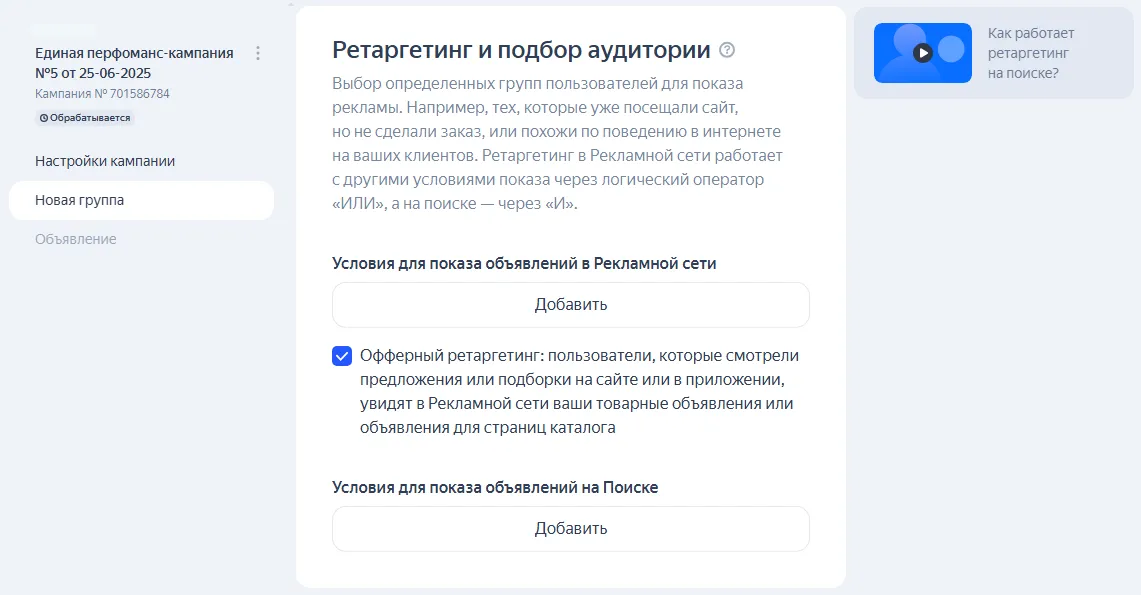 В блоке «Ретаргетинг и подбор аудитории» нажмите на кнопку «Добавить» и выберите нужные группы пользователей для показа рекламы, например «Покупатели» и «Похожие на покупателей».