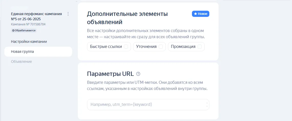 Параметры URL. По аналогии с кампанией UTM-метки можно настроить для группы объявлений, чтобы следить за переходами с конкретных креативов.