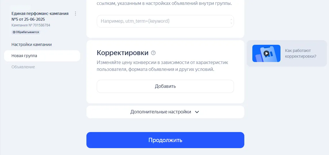 Корректировки. Выберите корректировки ставок для разных групп объявлений.