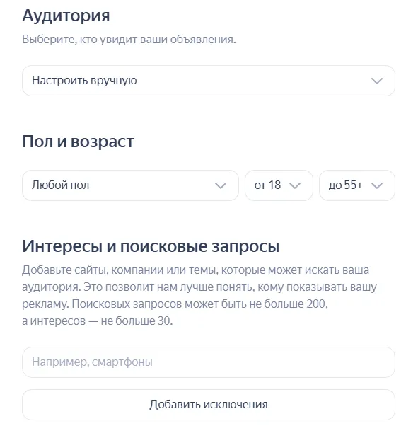 Часть настроек аудитории в РСЯ