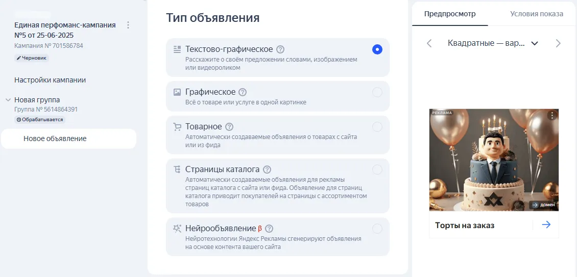 Настройки для разных типов объявлений отличаются. В пошаговой инструкции Точки рассмотрим, как запустить рекламу с текстово-графическим креативом.