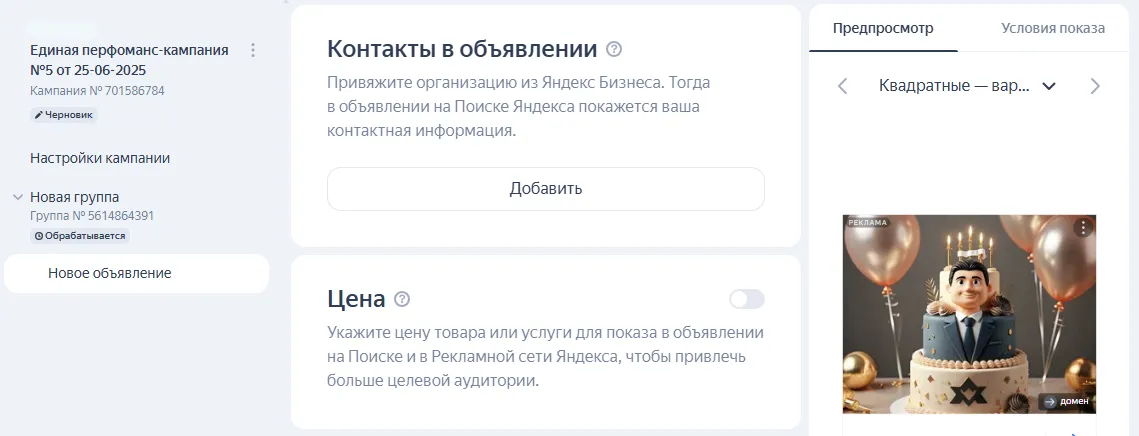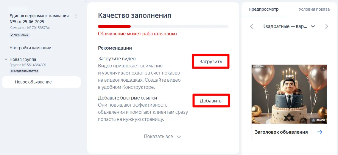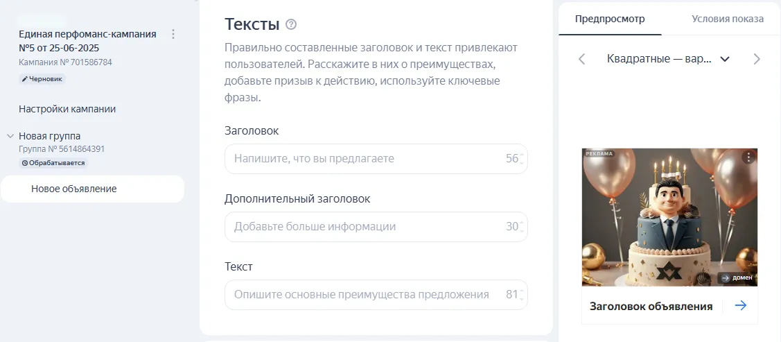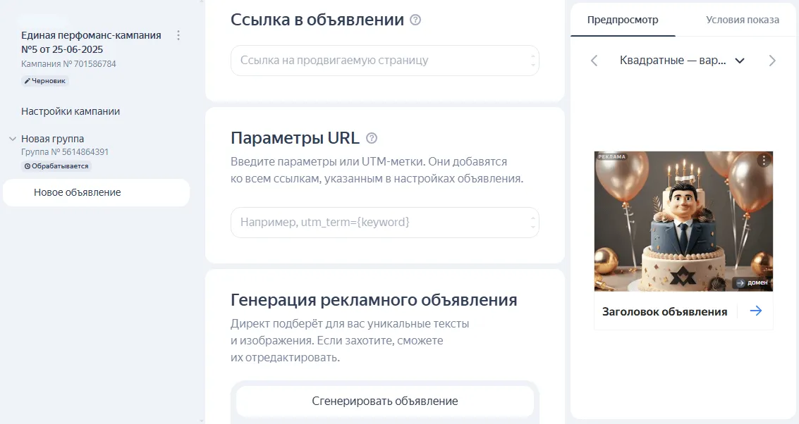 Генерация рекламного объявления. Директ может сгенерировать креатив самостоятельно, а вы внесёте правки.