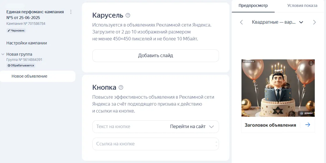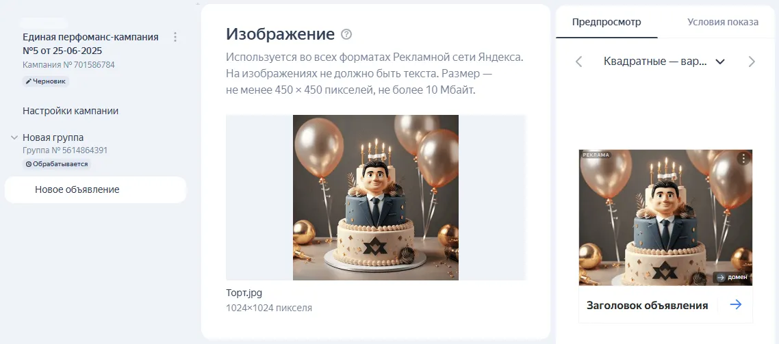 Изображение. Загрузите яркую и оригинальную картинку размером не менее 450×450 пикселей и не более 10 Мбайт. Она будет использоваться во всех форматах РСЯ.