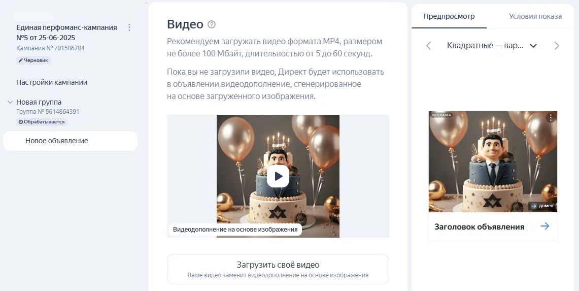 Видео. Загрузите видео формата MP4, размером не более 100 Мбайт и длительностью от 5 до 60 секунд. Если у вас нет готового ролика, Директ сгенерирует и использует видеодополнение на основе изображения.