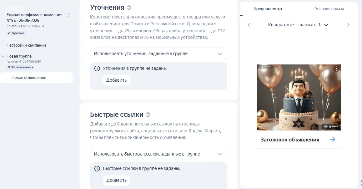 Уточнения и быстрые ссылки. Ранее мы задавали их для группы. Можно использовать прежние или задать новые для конкретного креатива.