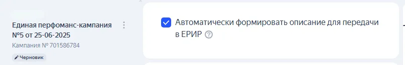 Маркировка. С 1 сентября 2022 года в России вся онлайн-реклама должна быть промаркирована. Нажмите на галочку, чтобы Директ автоматически сформировал описание для передачи в ЕРИР.
