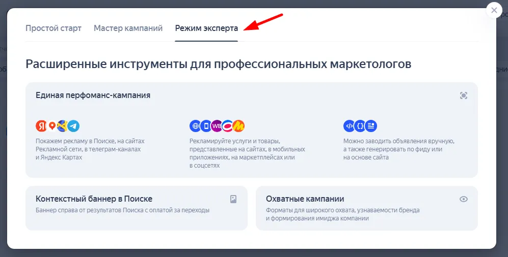 Перейдите в рекламный кабинет Яндекс Директа. В «Режиме эксперта» выберите «Единую перформанс-кампанию». Она даёт больше сценариев и возможностей для настройки.
