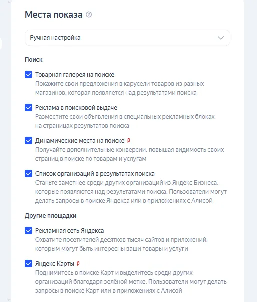 - ручная настройка: вы сами выбираете, где показывать вашу рекламу. Например, в поиске, рекламных блоках, поисковой выдаче, РСЯ и на Яндекс Картах.