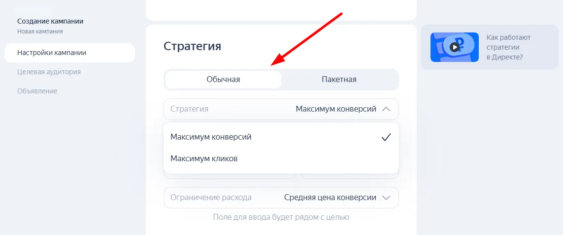 При обычной стратегии вы устанавливаете лимит по недельному бюджету, а алгоритмы вычисляют и выставляют оптимальные ставки. В пакетной используется одна стратегия для нескольких кампаний.