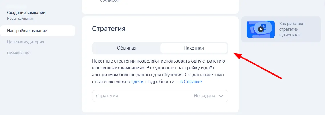 Пакетная стратегия позволяет установить единую стратегию сразу для нескольких кампаний.
