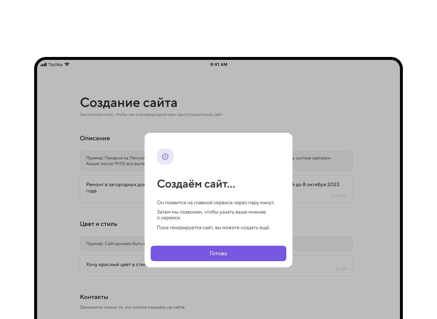 Шаг 3. Сгенерируйте сайт. Всё будет уникальным: от дизайна до контента. А если захотите что-то поменять, сможете сделать это в любой момент.