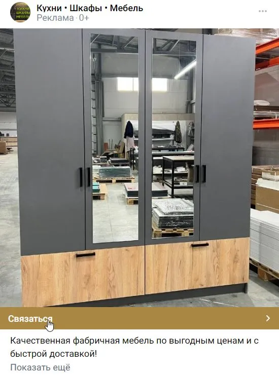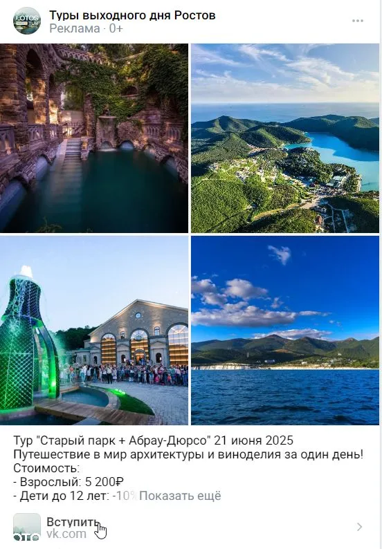 Несколько изображений объединены в одну композицию. Формат визуально выделяется в ленте и позволяет донести больше информации. В новом кабинете VK Ads создавать и запускать объявления в формате коллажа напрямую нельзя.