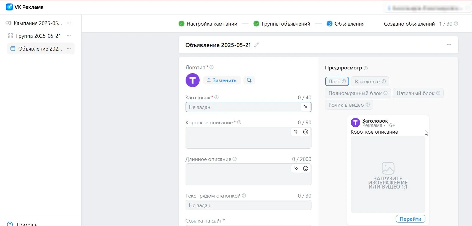 Загрузите тексты, изображения или видео для каждого объявления. Внимательно проработайте креативы, чтобы привлечь внимание целевой аудитории.