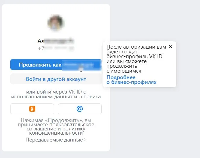 Через личный VK ID — это ваша учётная запись ВКонтакте. Для этого сначала зайдите в свой профиль ВК, потом вернитесь на страницу регистрации VK Рекламы и нажмите кнопку с вашим именем. Иногда может понадобиться подтвердить вход с помощью кода или SMS.