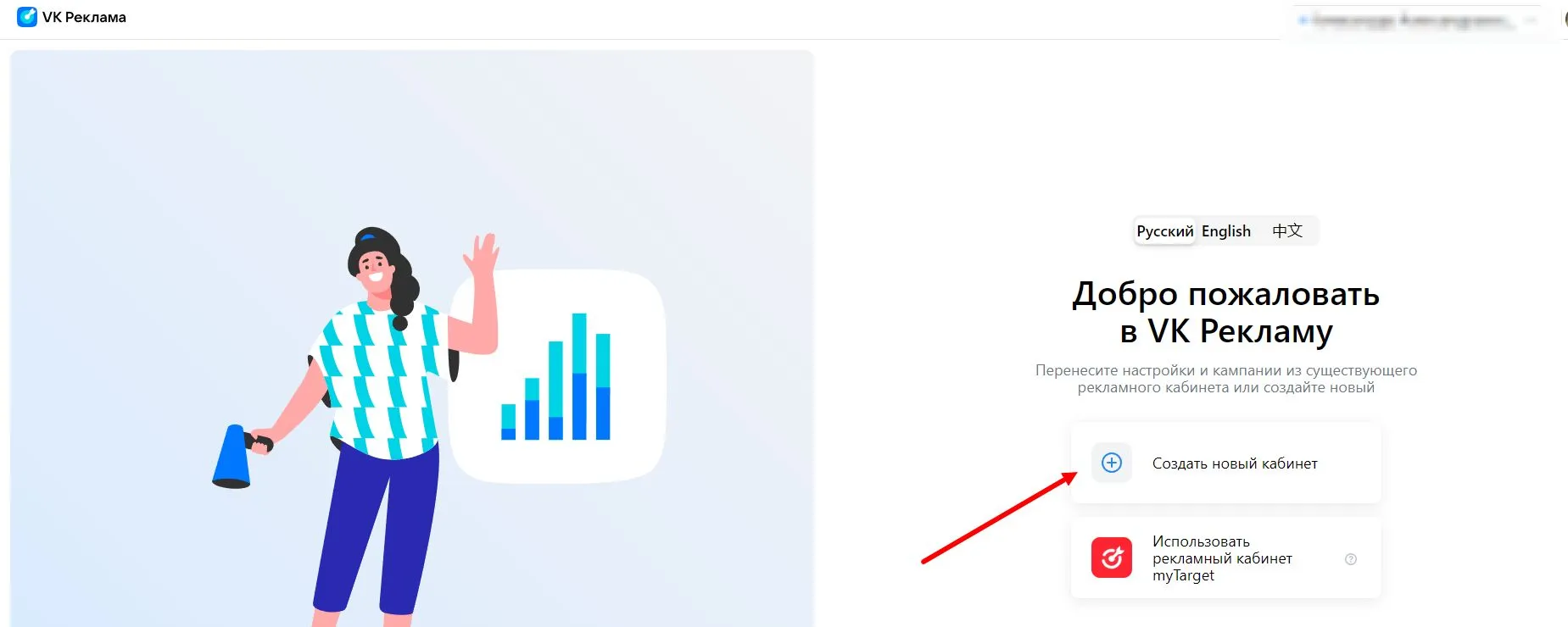 После авторизации выберите «Создать новый рекламный кабинет», если вы ещё не создавали его или хотите завести новый.