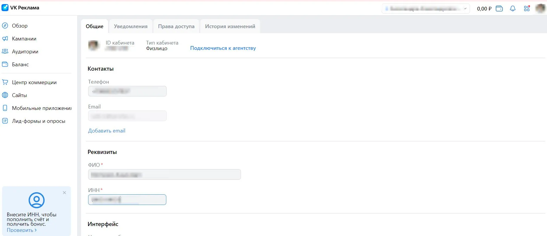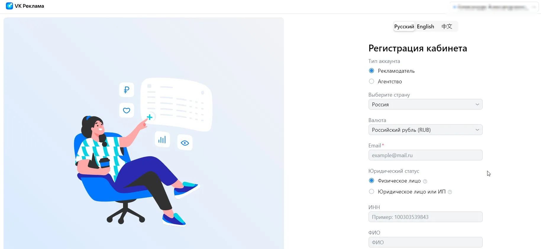 Укажите тип аккаунта (рекламодатель или агентство), страну, валюту и email. Физлицам потребуется ФИО и ИНН — эти данные обязательны по законодательству.