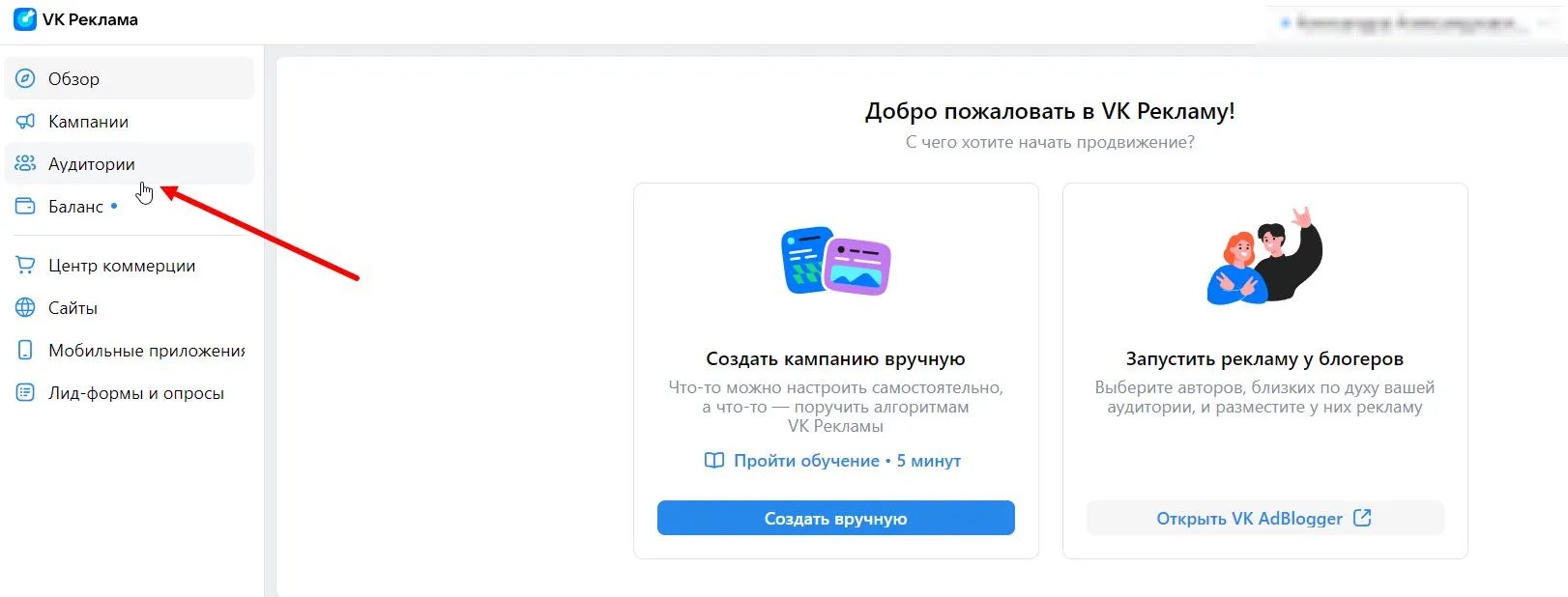 Откройте раздел «Аудитории» в интерфейсе ВК Адс.