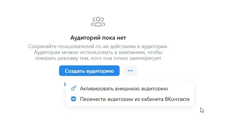 Рядом с кнопкой «Создать аудиторию» нажмите на значок с тремя точками, чтобы открыть дополнительное меню. В нём выберите «Перенести аудитории из кабинета ВКонтакте». Перенос доступен только для аудиторий от 2000 пользователей.