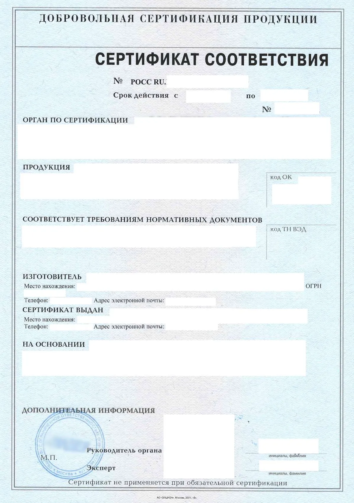 После успешного прохождения вы получите сертификат установленного образца. В нём будут указаны все основные данные о продукции или услуге, срок действия документа и реквизиты органа сертификации.