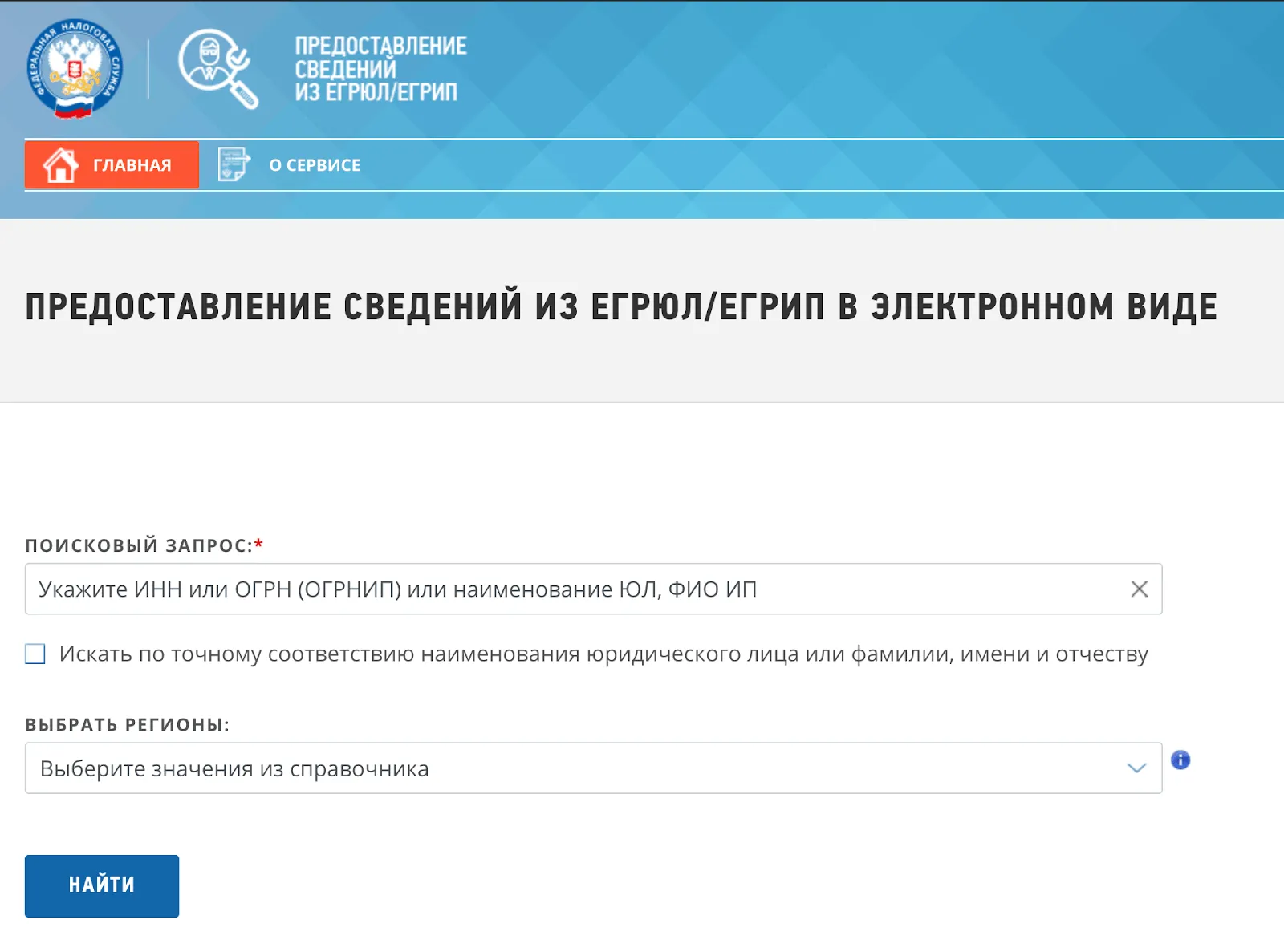 Перейдите в сервис и укажите наименование организации. Если название не уникальное, в поиске появятся несколько компаний — выберите свою по дате регистрации, юридическому адресу, Ф.И.О. учредителей или руководителя.