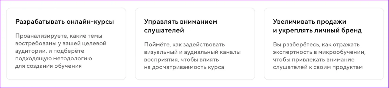 В идеале посетитель за 30 секунд должен понять, о чём курс и чему учите.