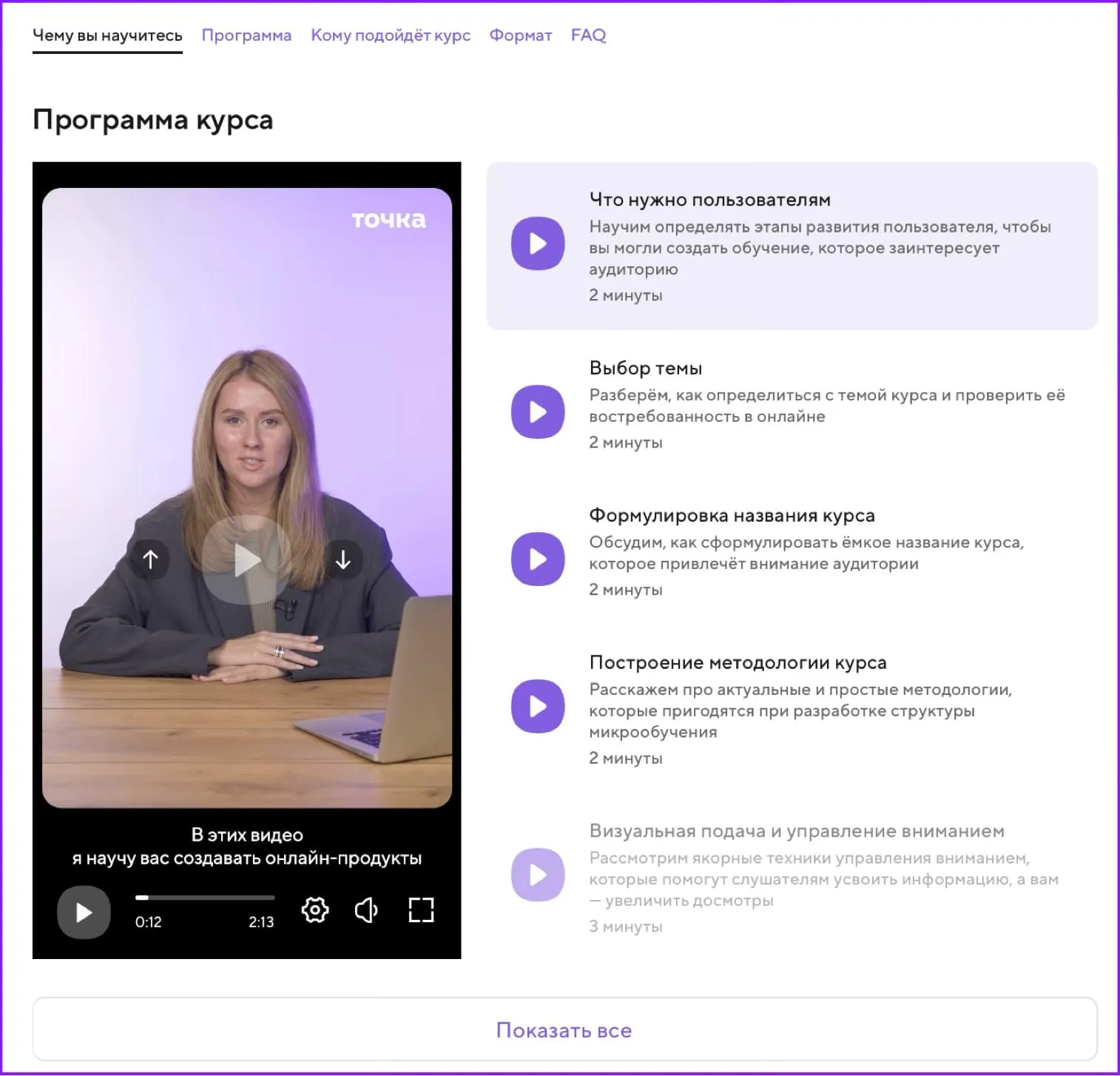 - Программа курса с понятными названиями модулей и уроков.