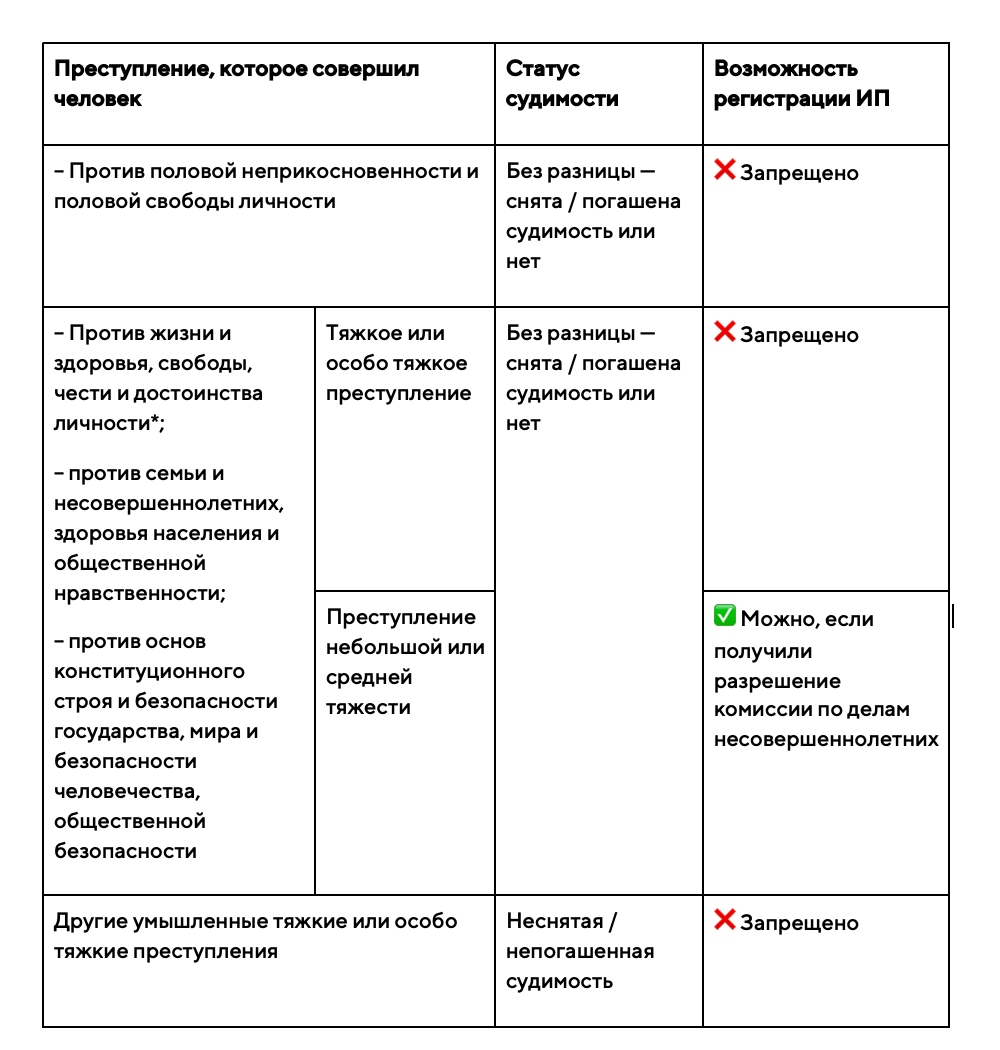 Правило такое: открыть ИП не получится, если есть неснятая или непогашенная судимость за преступления из статьи 328.1 Трудового кодекса. Или идёт уголовное преследование за эти же преступления.