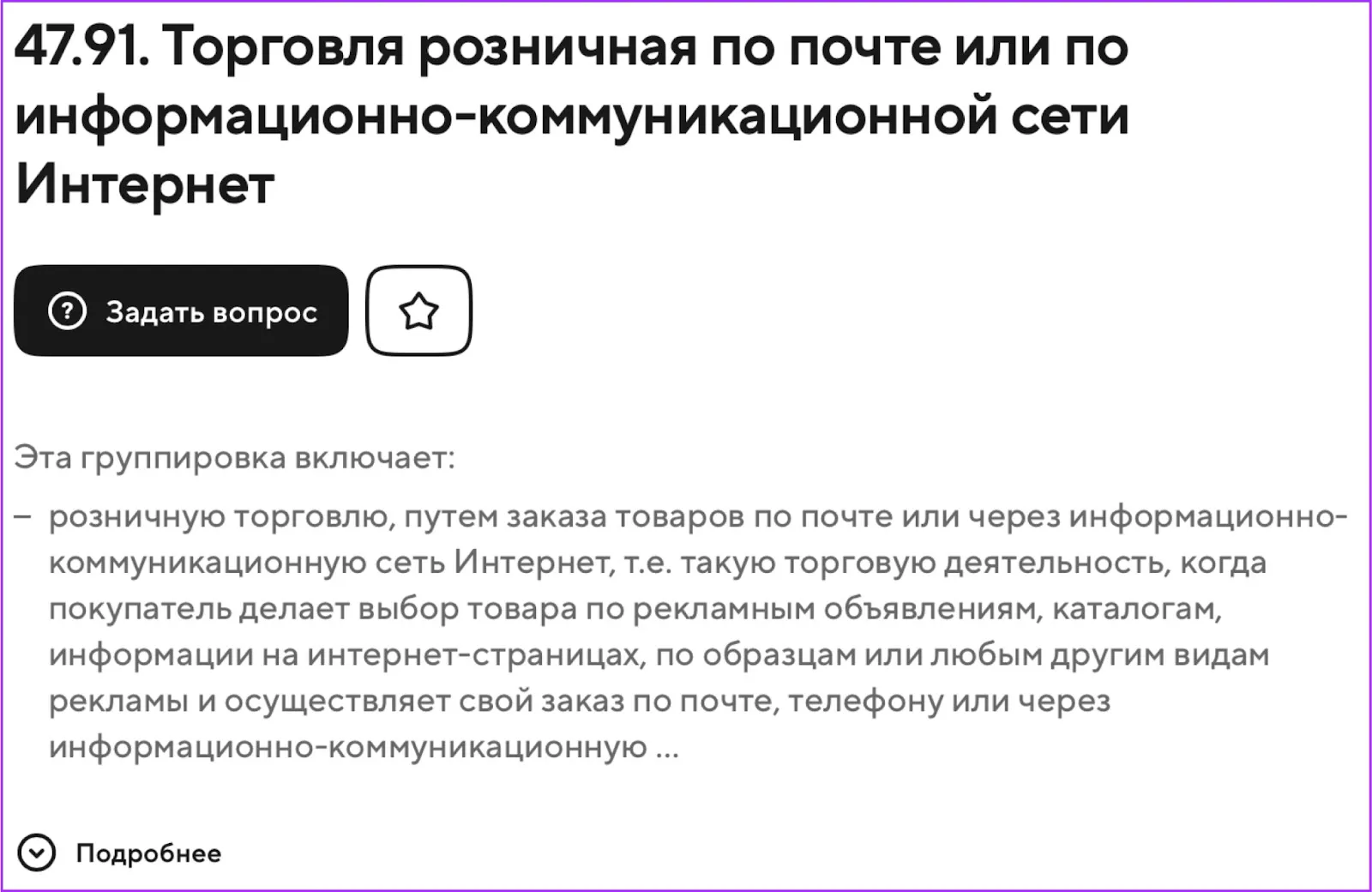 Рассмотрим пример: вы предприниматель и собираетесь заняться торговлей — как селлер на маркетплейсе или открыть свой интернет-магазин. Основной код тогда должен отражать торговлю через интернет.