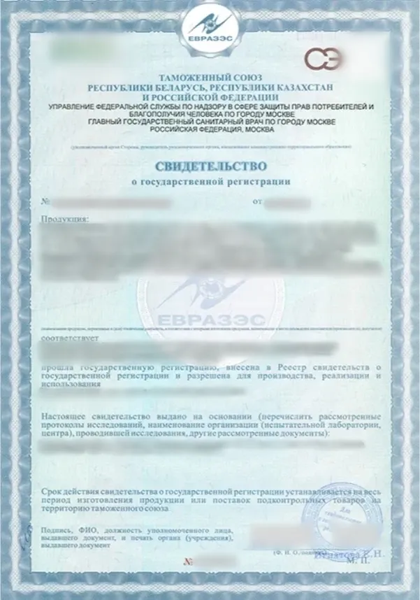 - Свидетельство о государственной регистрации (СГР) — подтверждает гигиеническую, санитарную и эпидемиологическую безопасность, выдаёт Роспотребнадзор.