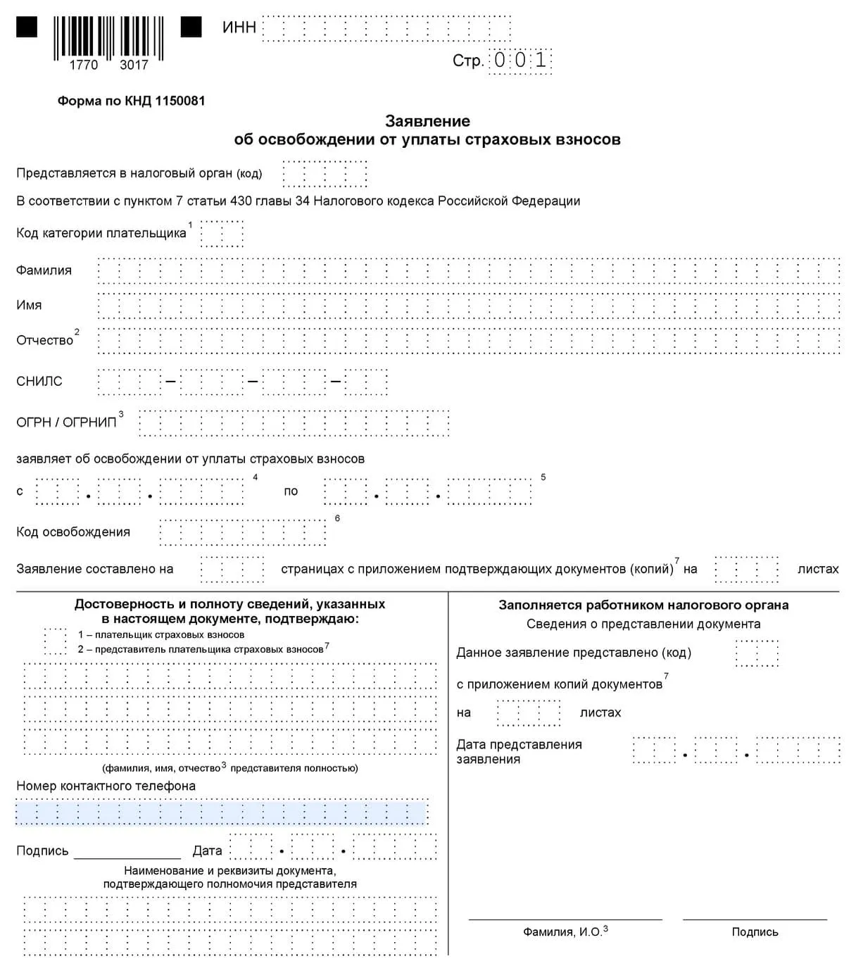 Чтобы не платить страховые взносы, нужно подать в свою налоговую заявление по форме КНД 1150081. К нему приложить документы, которые подтверждают ваше право на освобождение. Полный список — в приложении к письму ФНС от 09.12.2024 №БС-4-11/13952@.