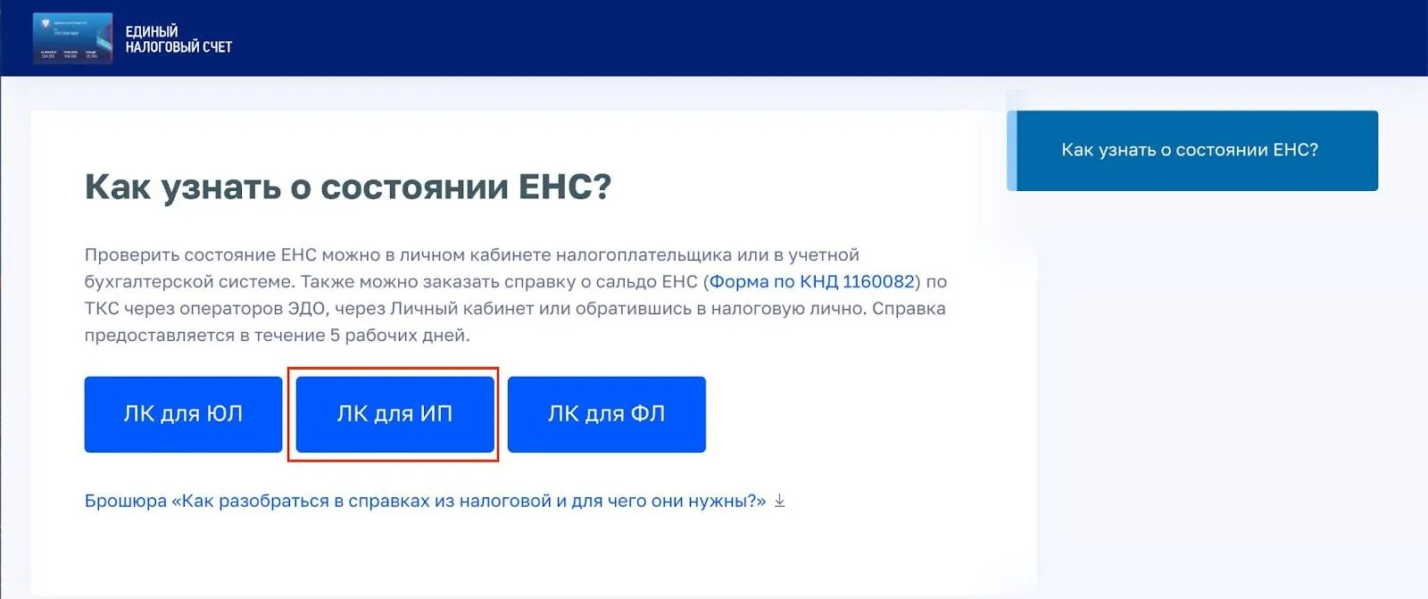 На портале откройте раздел «Как узнать о состоянии ЕНС?» и нажмите кнопку «ЛК для ИП» для входа или регистрации в личном кабинете.