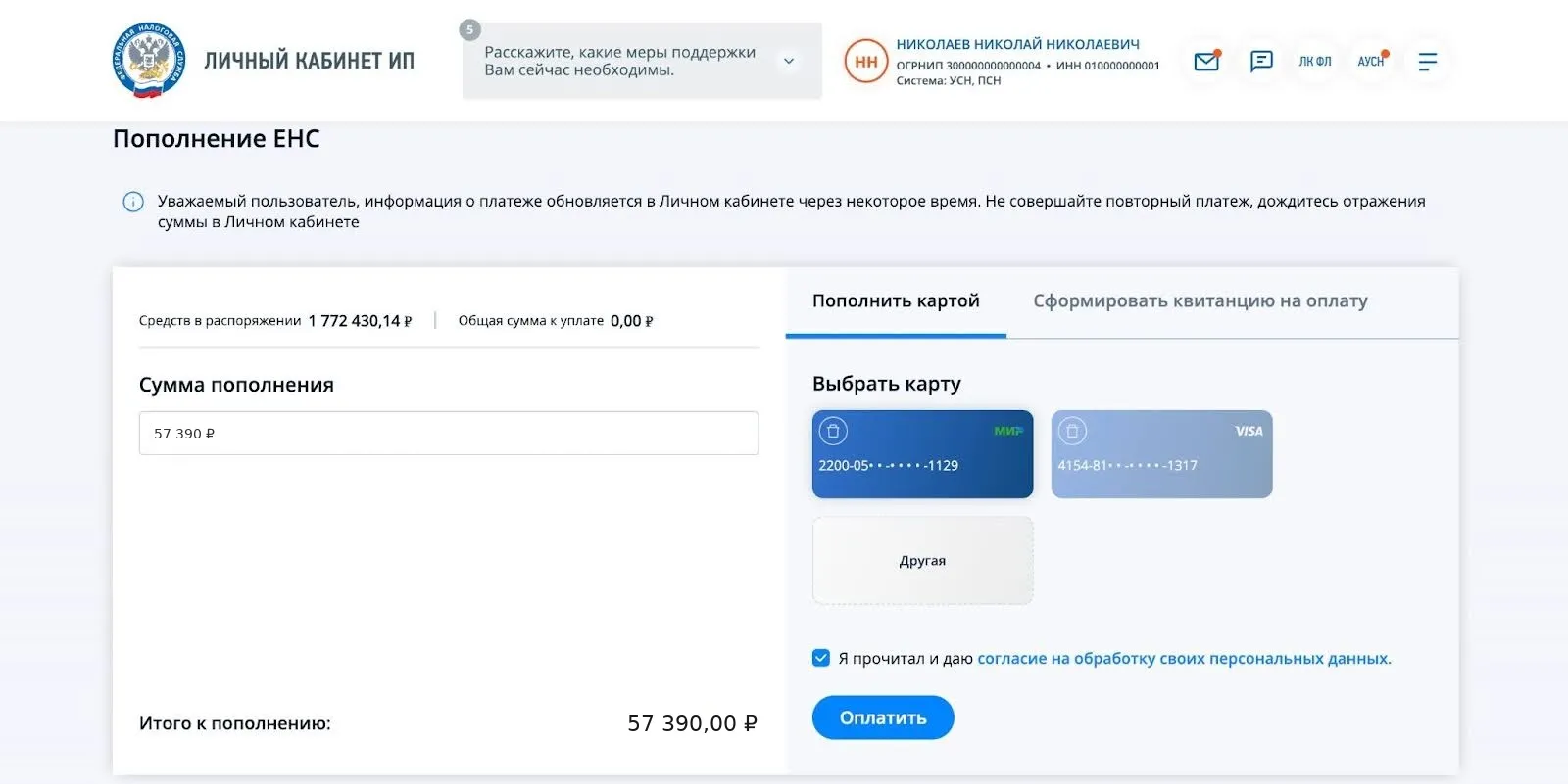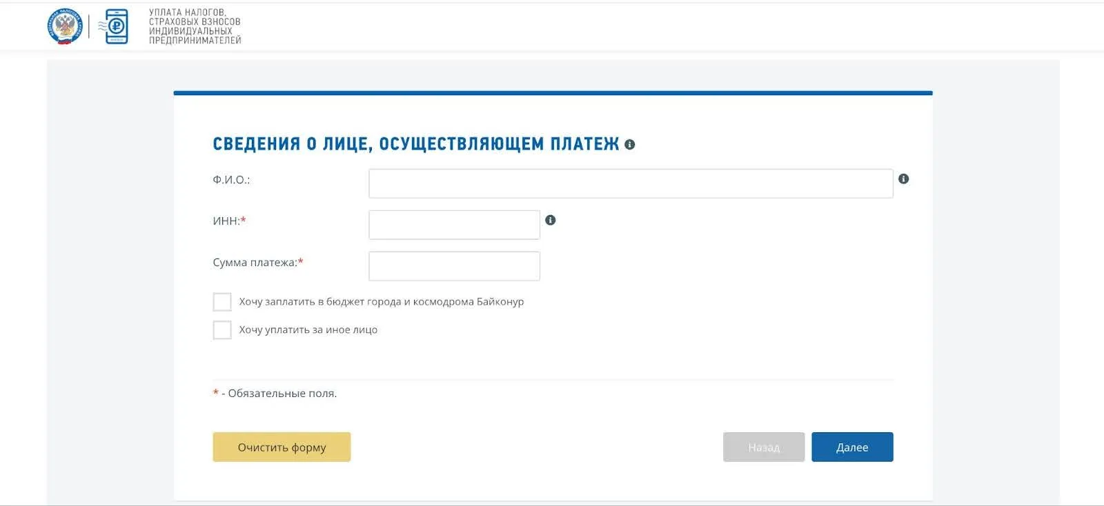 Альтернативный и удобный способ уплаты страховых взносов для ИП — оплата по квитанции, сформированной на сайте ФНС. Большинство данных заполняется автоматически, что снижает риск ошибки. Чтобы создать такую квитанцию, достаточно ввести ФИО, ИНН и сумму платежа.
