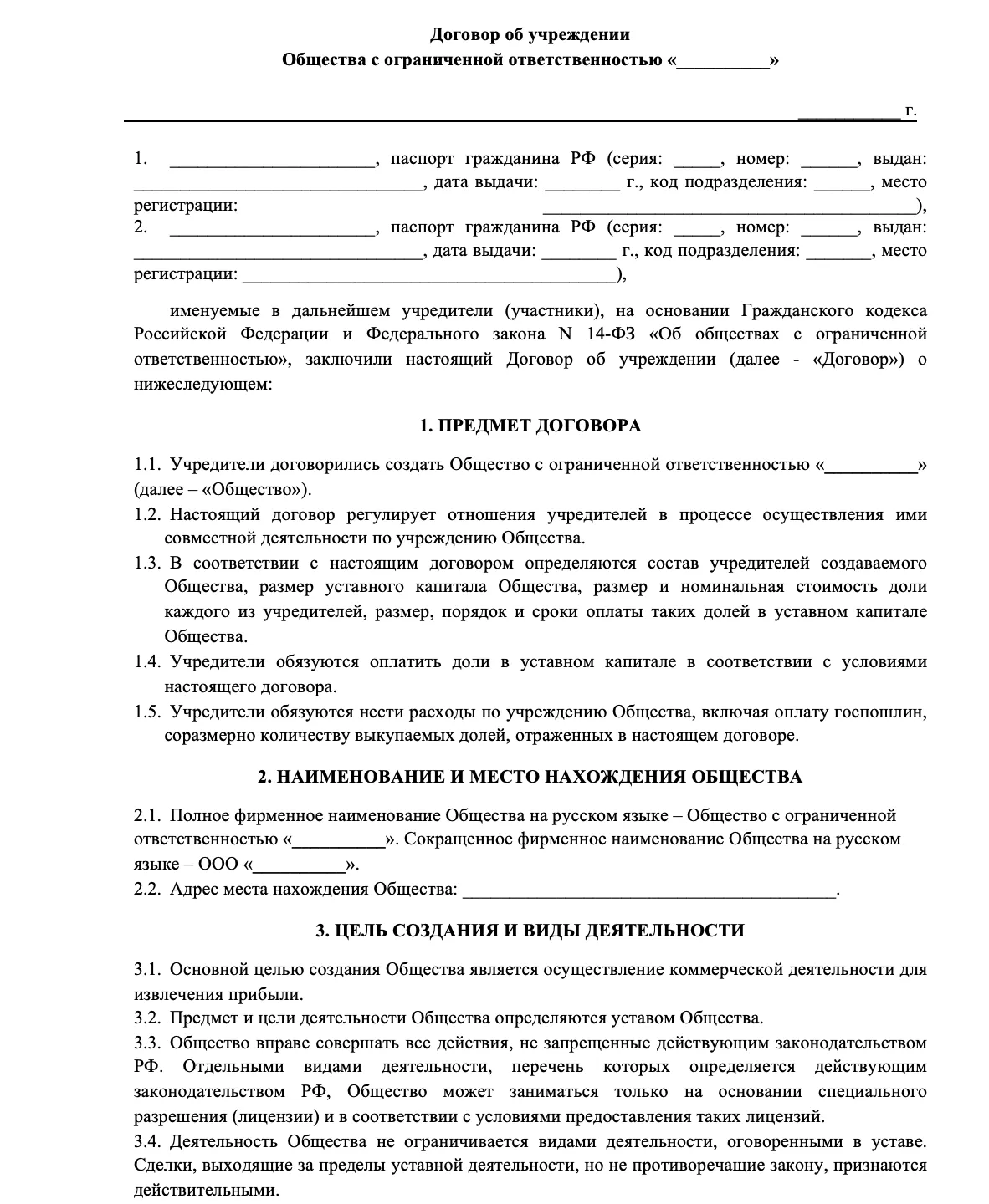 Договор об учреждении общества составляют в письменной форме. В нём указывают основные пункты: