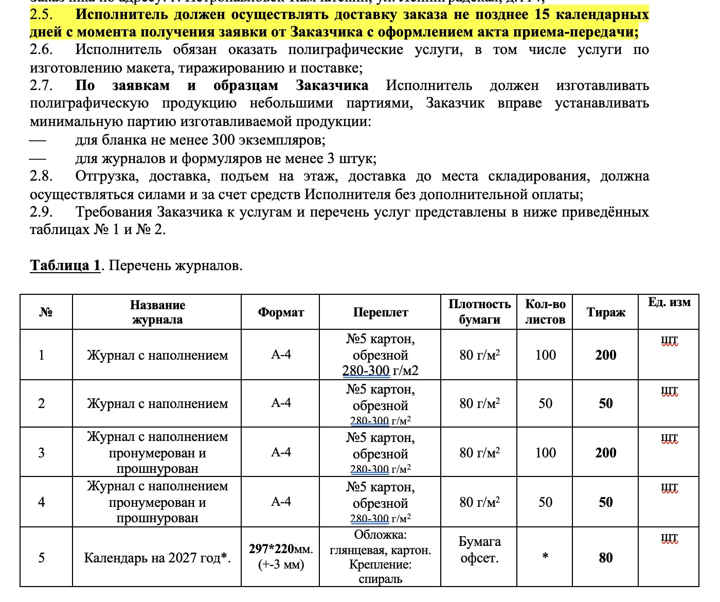 В техзадании перечислена вся продукция, которую закупят у поставщика: четыре варианта журналов и календари