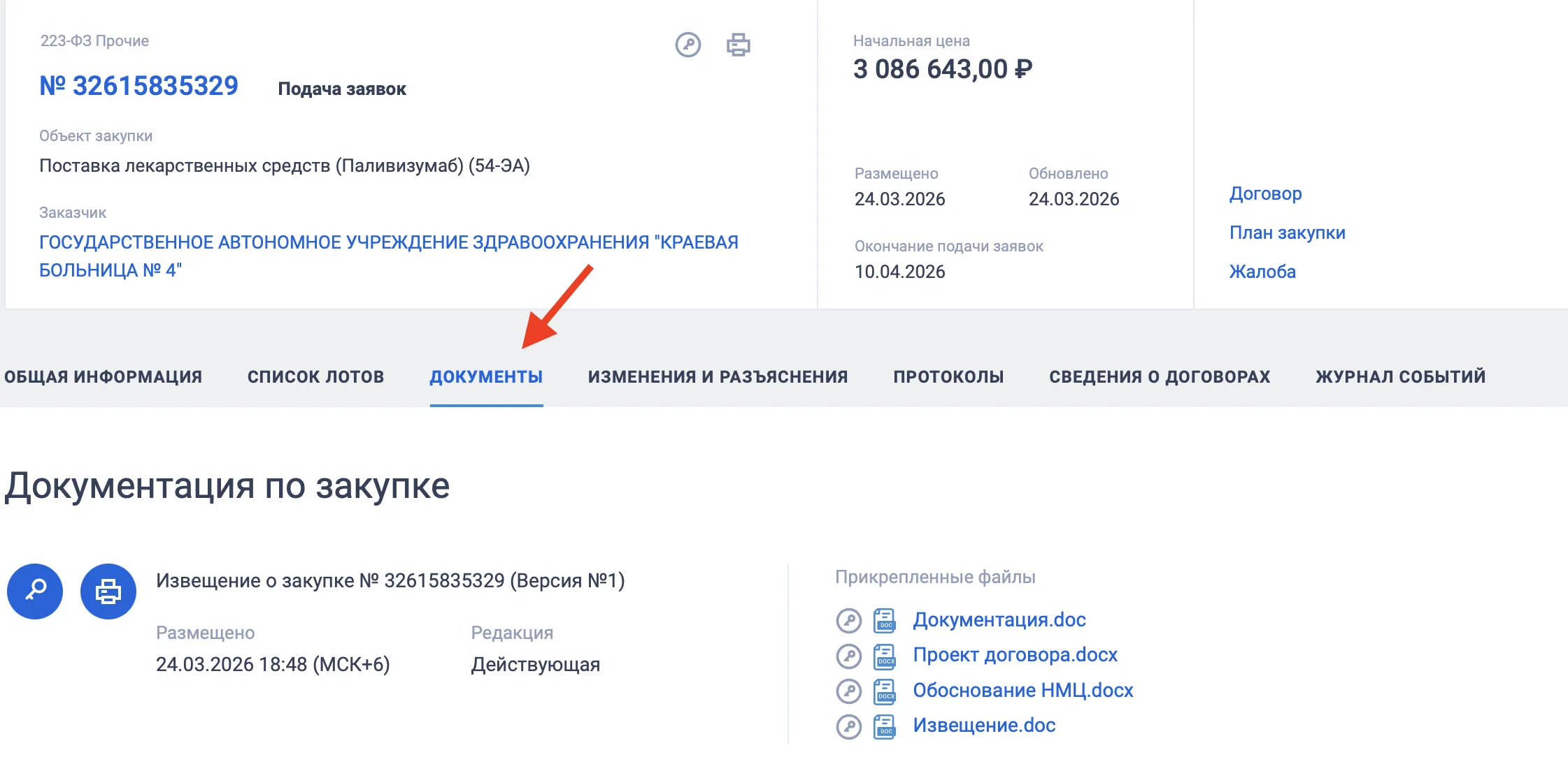 В раздел «Документы» добавляют извещение, обоснование НМЦК, проект договора и другие файлы