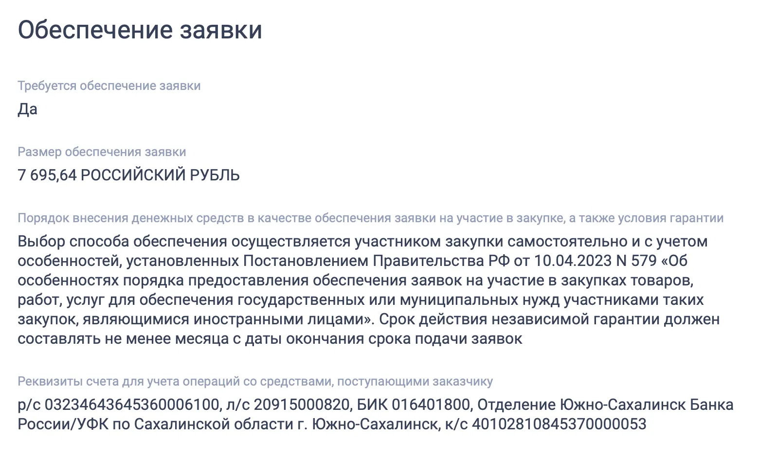 В карточке указано, что обеспечение заявки обязательно и составляет 7 695,64 ₽