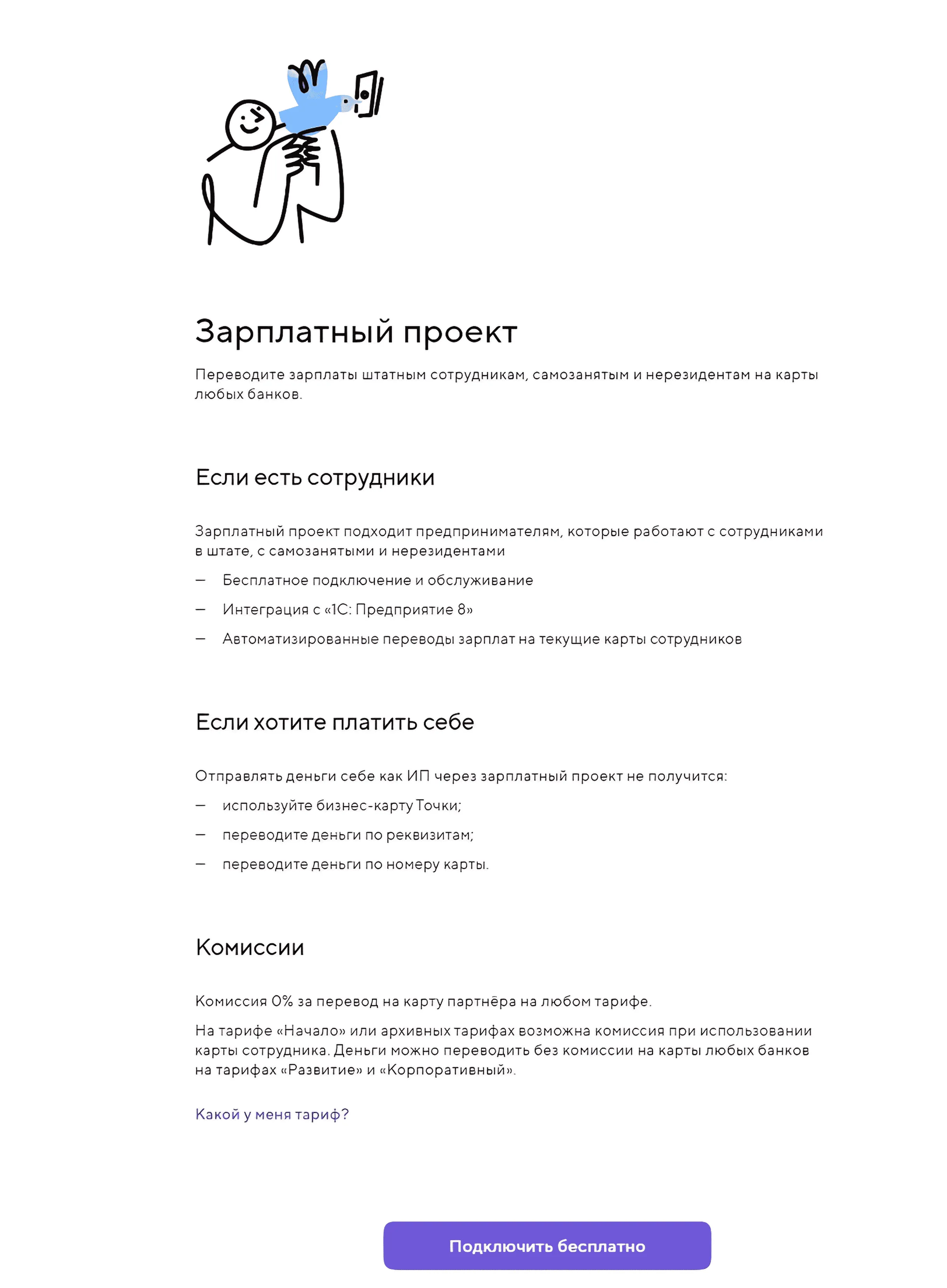 Для клиентов Точка Банка не нужны дополнительные документы на подключение Зарплатного проекта. Подключить его можно в интернет-банке.