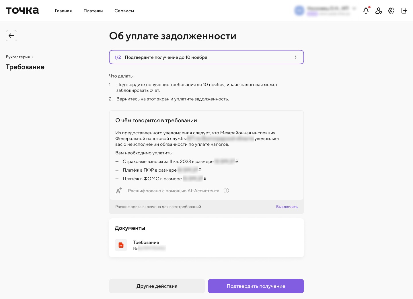 «Мы видим, что многим предпринимателям бывает непросто разобраться в уведомлениях от налоговой: формализованный текст, юридический язык, и с первого прочтения могут возникнуть сложности. При этом сроки ответа ограничены, а разбор документа, консультации и поиск решения требуют времени. Мы в Онлайн-бухгалтерии автоматизировали этот процесс: ИИ-Ассистент сразу объясняет, о чём документ, и подсказывает, что нужно делать дальше, например, предоставить пояснения по отчёту или заплатить налоги», — комментирует директор по продукту «Точка Бухгалтерия» в Точке Даниил Смирнов.