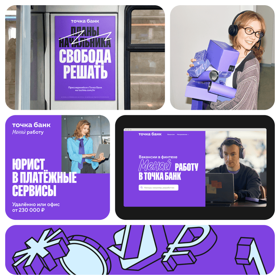Новый HR-фирстиль — это визуальный язык для коммуникаций с кандидатами и сотрудниками, который отражает подход банка к работе, людям и изменениям. Он помогает выделиться в инфополе, но сохраняет связь с основным брендом Точка Банка.