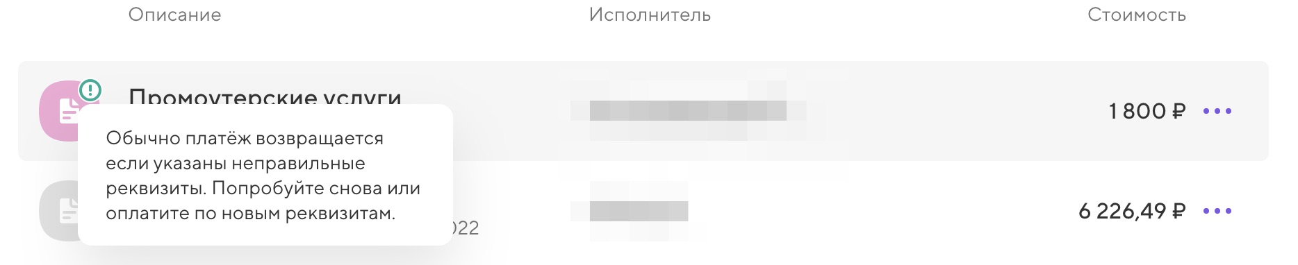 Оплата задания возвращается, когда реквизиты получателя указаны неверно или не совпадают с именем исполнителя.