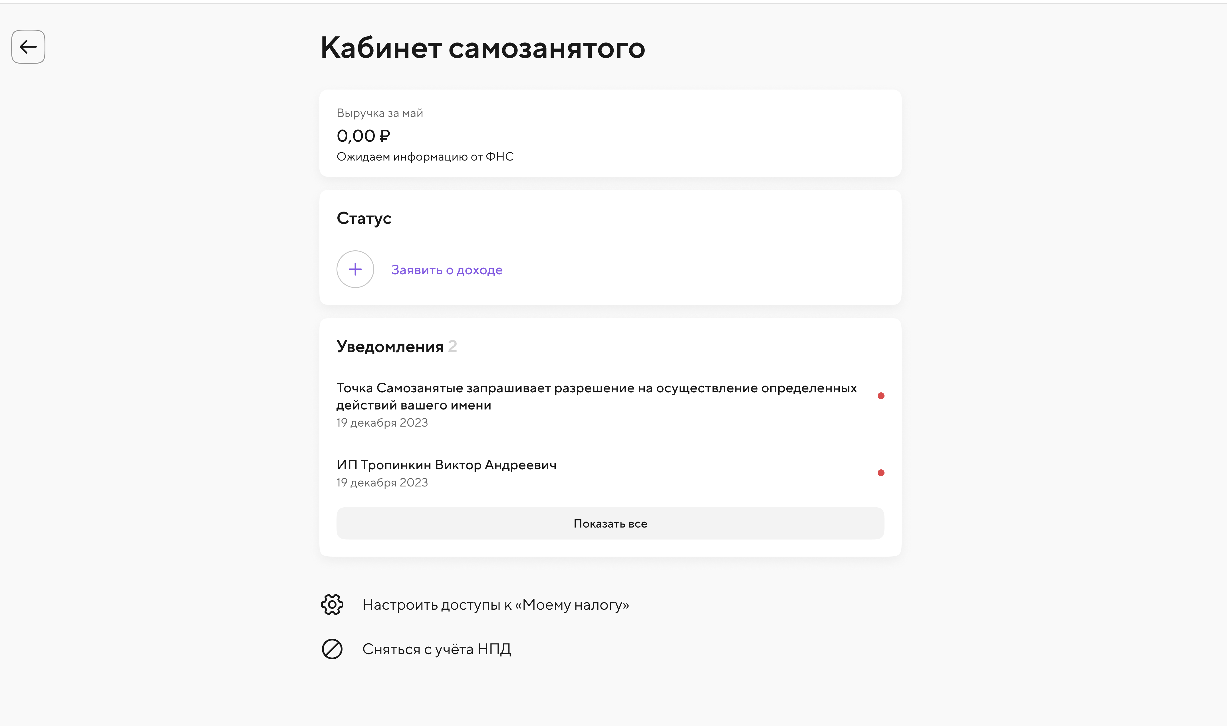 Сервис заменяет приложение «Мой налог» от ФНС, а значит, управлять своей деятельностью можно прямо в интернет-банке Точки: регистрировать чеки, заказывать справки и получать уведомления от ФНС.